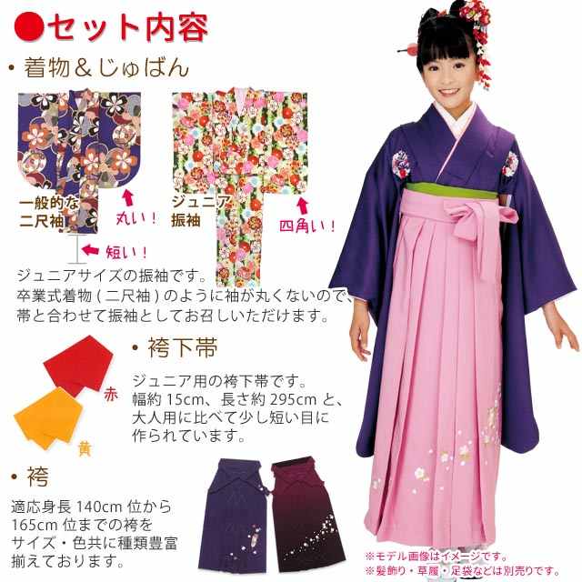 ※所要日数 7日〜10日程小学校 卒業式 女の子用 ジュニア振袖 袴セット ジュニア用の振袖着物と袴、襦袢、袴下帯の4点セットです。