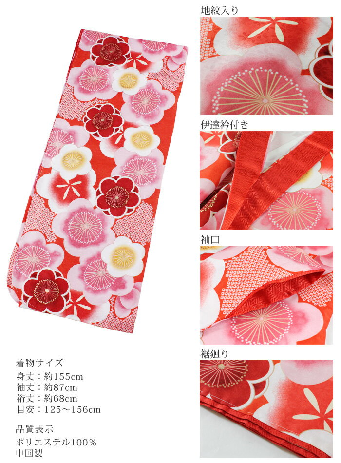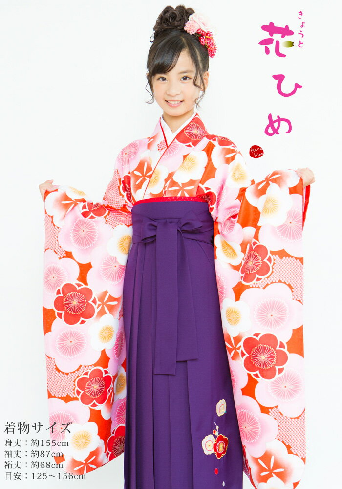 商品 花ひめ・梅ちらし赤 着物・襦袢・帯・袴4点セット サイズ ◆着物 身丈約155cm/袖丈約87cm/裄丈約68cm ※商品には「13才」と表示がされています。